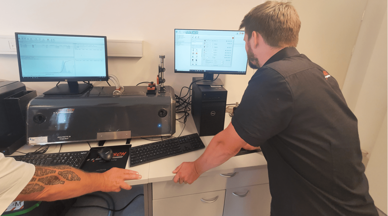 Even FRITSCH product specialist Maik Paluga discovered some very convenient features while giving the training to the staff of the department. „We connected the wet dispersion unit to the A-22 and control the process this way. From the measurement cell of the Laser Particle Sizer the sample goes directly to the cell of the ANALYSETTE 28 where a live stream of the particle flow can be monitored. This way there is no more guessing, whether you are measuring agglomerates or air bubbles in case your data graph shows peaks at unexpected size classes. You can directly see what you are measuring with your own eyes. “